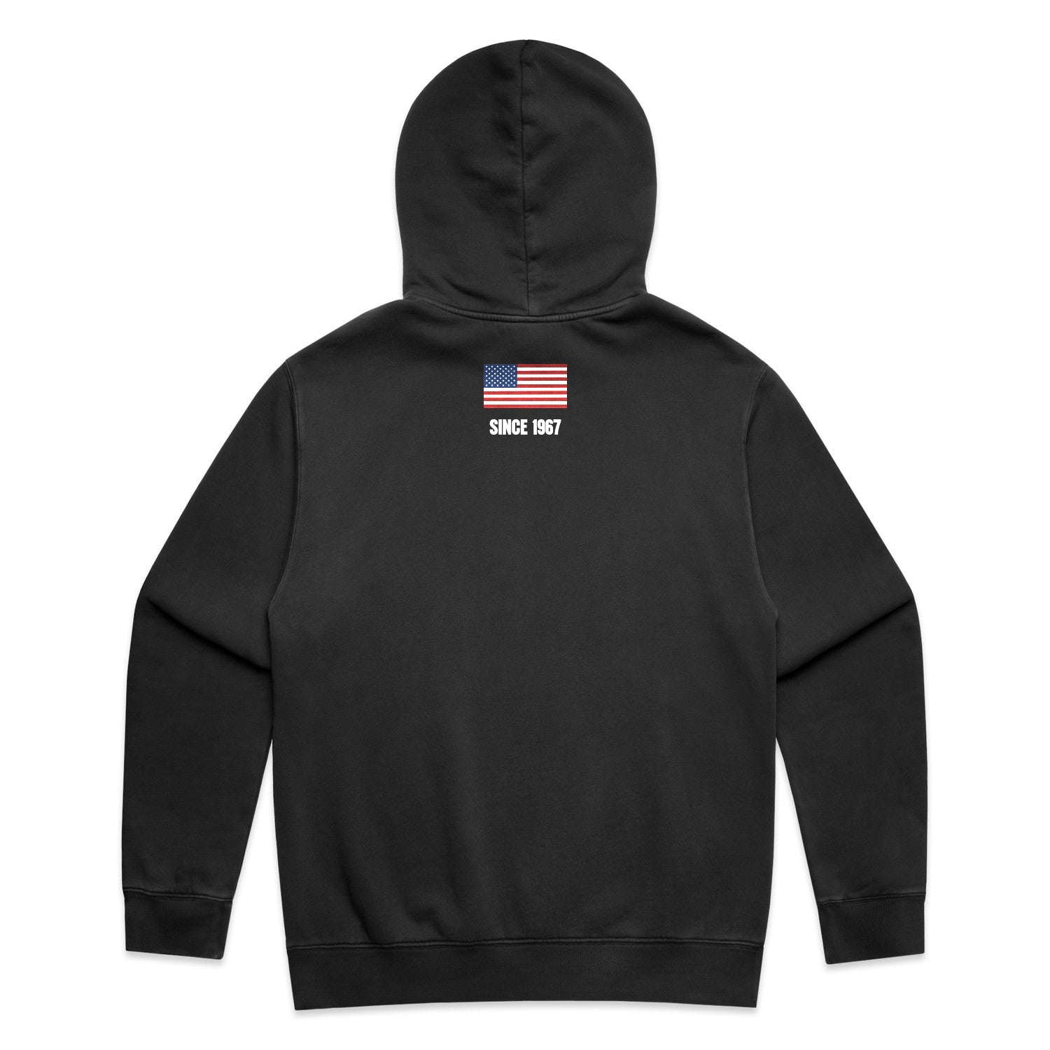 Pre-shrunk to minimise shrinkage, pullover hood, drop shoulder, kangaroo pocket, self-fabric lined hood, no drawcord, garment dyed, sleeve cuff ribbing