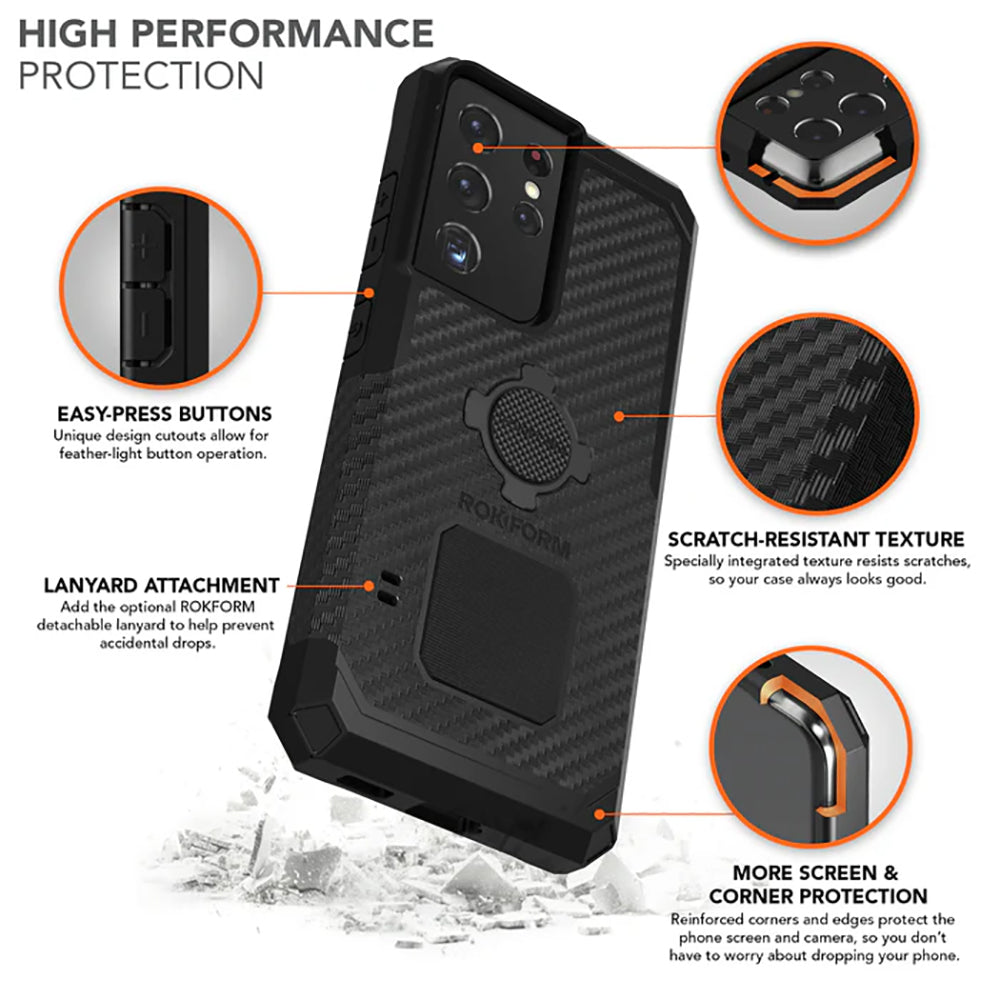 The item up for sale is for a brand-new Rok Form Rugged Case For a Samsung Galaxy S21 Ultra 5G. Our best-selling RUGGED case just got even better for the new Samsung Galaxy S21 ULTRA 5G. Our new Galaxy S21 ULTRA 5G case has even more screen, corner, and camera protection without adding bulk, so it still feels slim and fits easily in your pocket, but you don't have to worry about drops of up to 6 feet! We have also increased the magnet size and force for even more holding power at the gym, on your fridge, toolbox, and even the golf course. Now included in each of our Galaxy S21 ULTRA 5G Rugged cases for the iPhone is our Magnetic RokLock Plug for extra hold and perfectly balanced landscape and portrait mounting on our Vent Mount, Swivel mount, and Low Pro car mounts, allowing for easy reading of your maps, GPS and incoming calls. The integrated ROKLOCK® twist-lock lets you indulge in effortless, secure mounting of your phone to bicycles, cars, motorcycles, and more. The scratch-resistant carbon fiber texture and anti-slip grip mean your phone case will always look great, and you won't have to worry about it sliding around. Like all ROKFORM cases, a lanyard slot comes standard and will work with almost any lanyard for extra security and drops prevention. The new Galaxy S21 ULTRA 5G cases are wireless charging compatible by removing the center magnet and have oversize ports for using the smart connector and all other functions. With the lower magnet still intact, you can still wireless charge while utilizing magnetic mounting and all of our mounts. If you are not a wireless charging type person, leave both magnets in and simply plug your phone into our oversize charging parts. With so many ways to use this case, you will wonder how you ever went without it once you try it. This item will arrive in its original packaging. This item is in New condition.